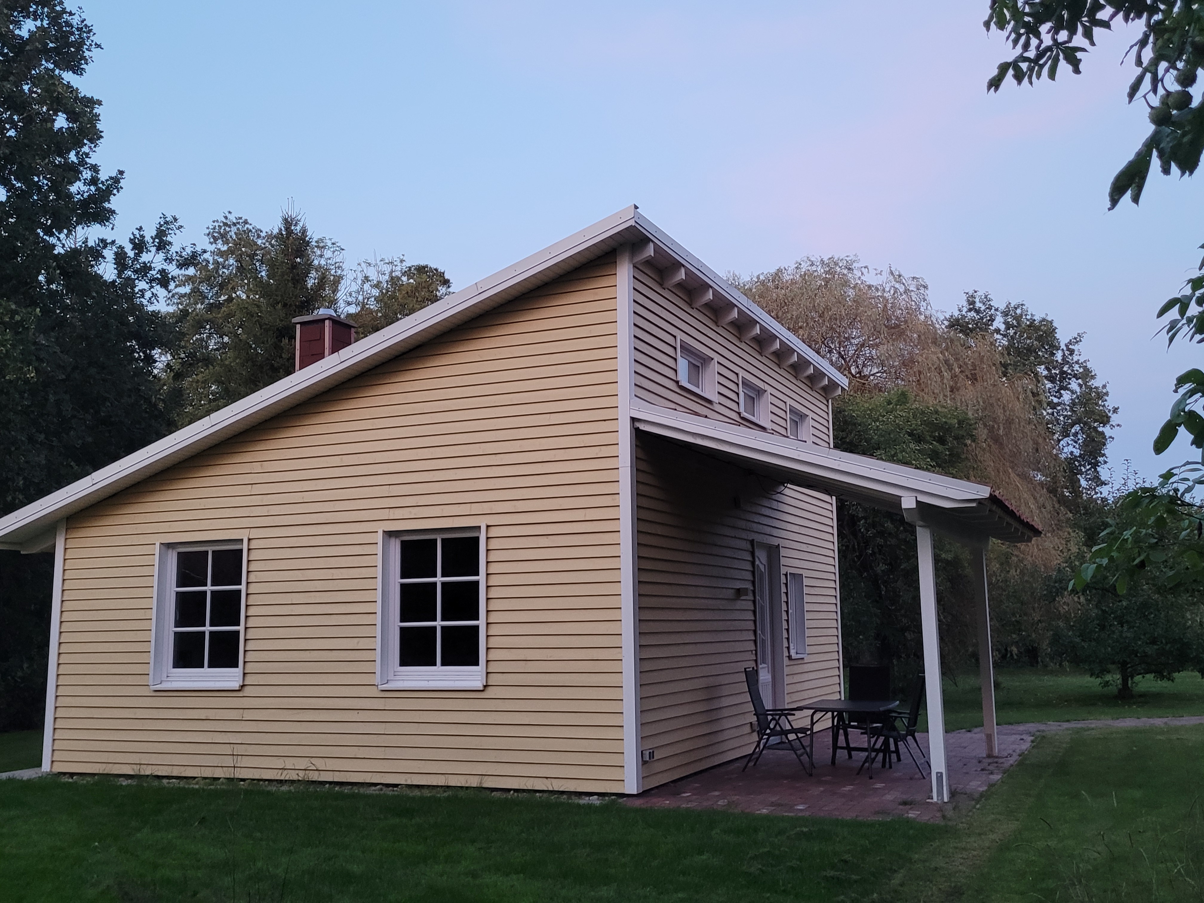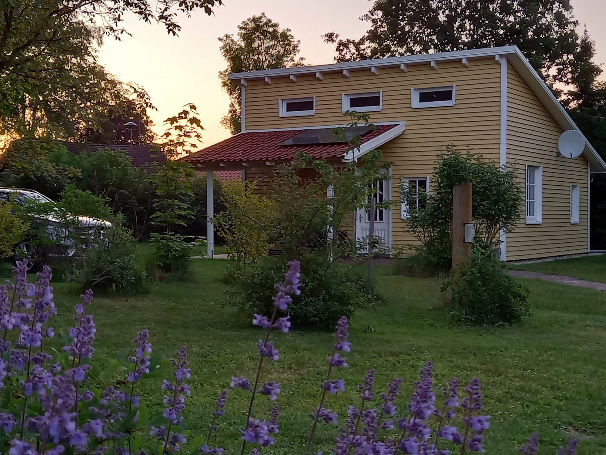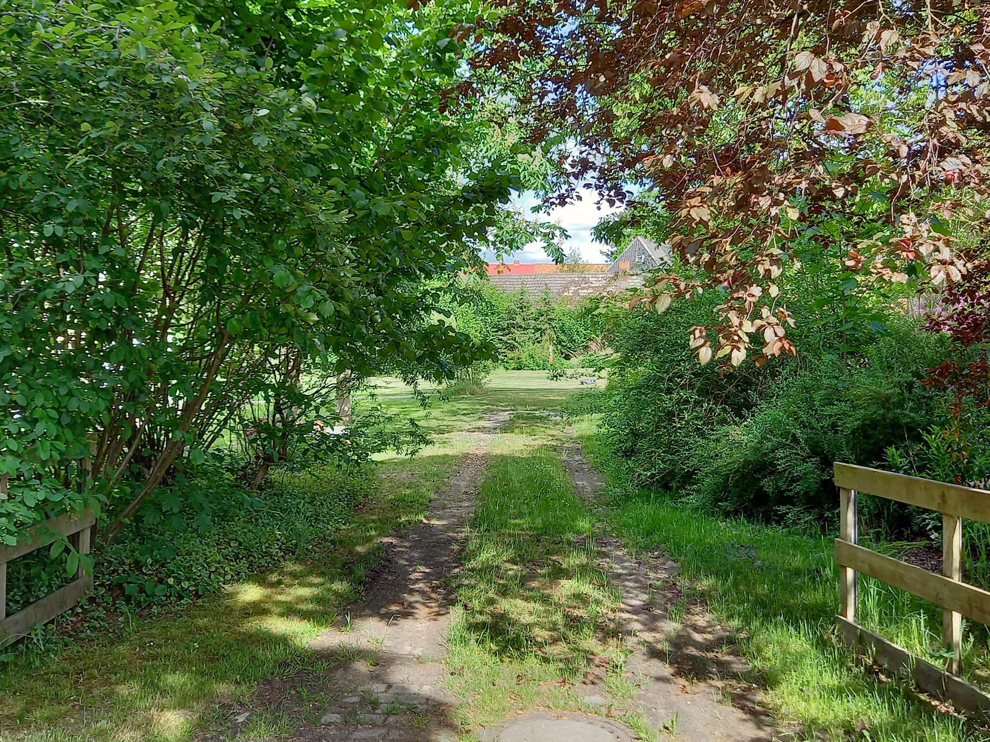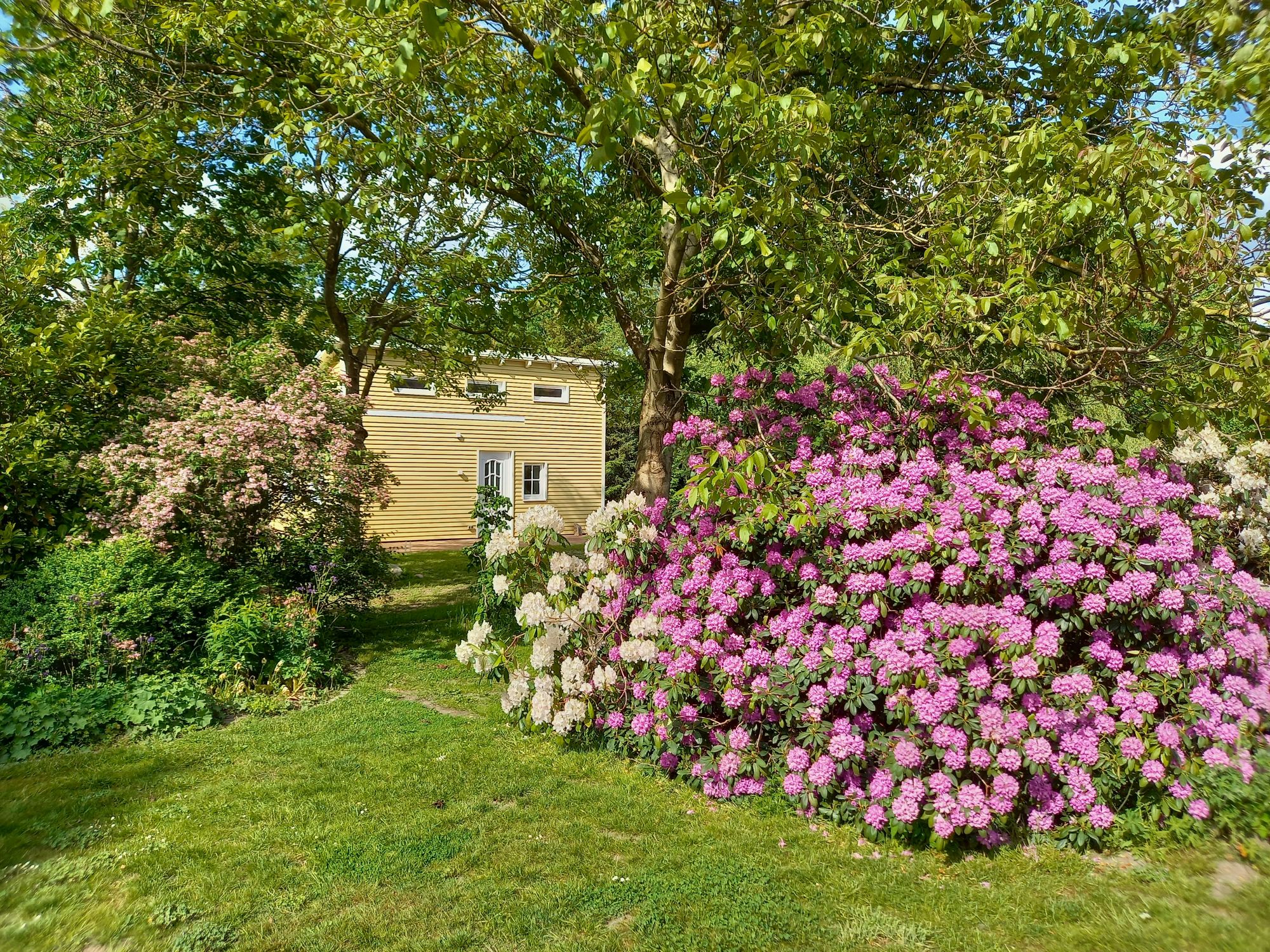 Das Ferienhaus liegt innerhalb eines großen Gartens mit altem Baumbestand. So sind Freizeitaktivitäten für die ganze Familie möglich. Die Einsicht von der ruhigen Seitenstraße ist durch die dichte Bepflanzung eingeschränkt.